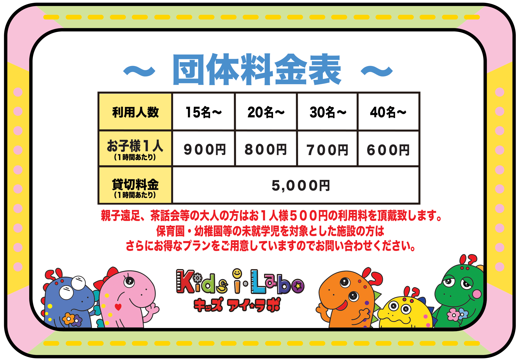 - 団体予約は子ども15名以上から受付可能です。(30名様以上は必ず貸切)