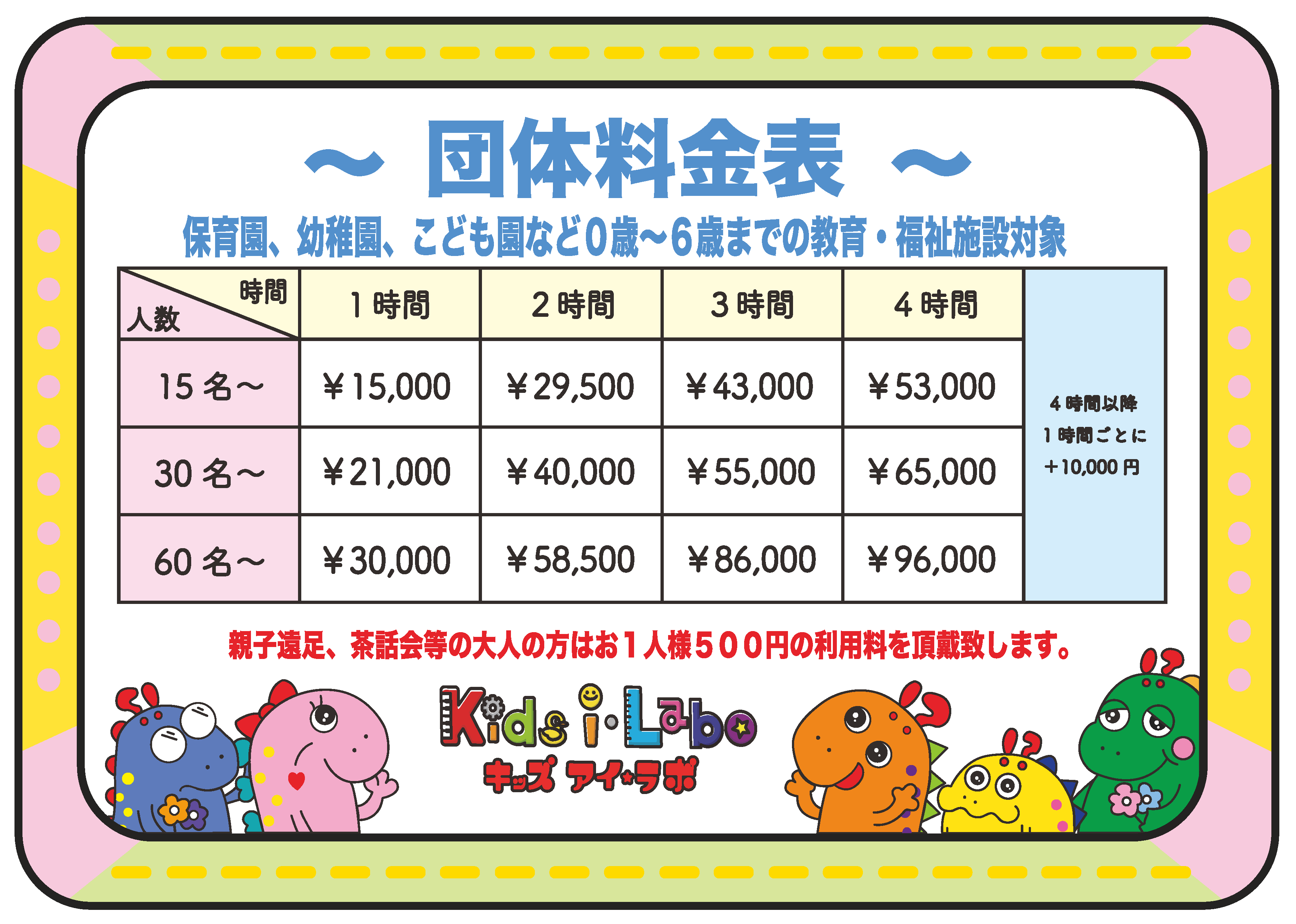 - 子ども3名に対して大人1名以上の保護者の入場が必要です。(大人1名につき別途500円)
